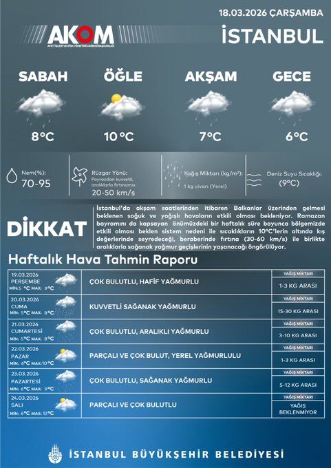 Akşam saatlerinden itibaren hava sıcaklığı hissedilir derecede düşecek. İstanbul Büyükşehir Belediyesi Afet İşleri ve Risk Yönetimi Dairesi Başkanlığı soğuk ve yağışlı hava sisteminin, önümüzdeki bir haftalık süre boyunca aralıklı şekilde etkili olacağını bildirdi.
